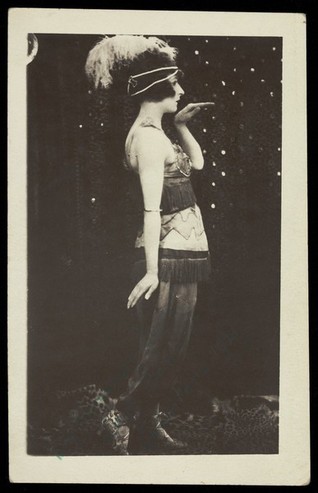 An actor in drag, poses mid-dance, wearing a feathered head garment and a tassled dress. Photographic postcard, 1921.