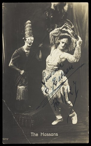 "The Hassans" in character, performing on stage. Photographic print, 192-.