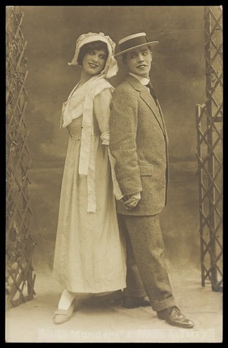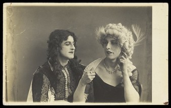 Two actors pose on stage: a man wearing top hat and tails gazes down at a man in drag. Photographic postcard, 192-.