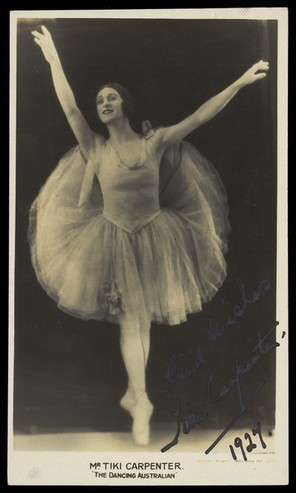Tiki Carpenter in drag as "The dancing Australian". Photographic postcard, ca. 1927.