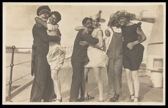 Sailors, some in drag, pose as three couples on the deck of a ship. Photographic postc...