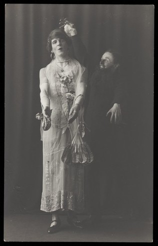 Ralph Mellor in drag and another actor perform a scene in Trilby. Photographic postcard by L.S. Langfier, 192-.