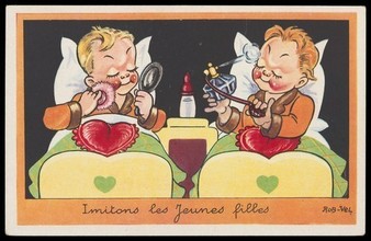 Two young boys in single beds applying make-up and perfume to themselves. Colour process print after Rob-Vel, 193-.
