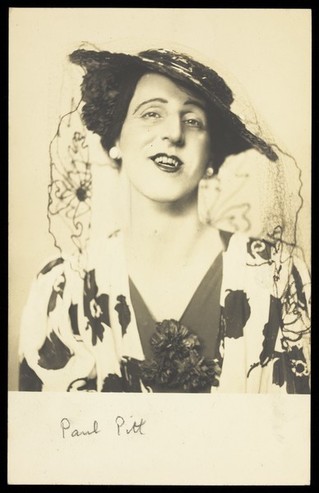 Paul Pitt in drag, posing in flowery garments. Photographic postcard, 194-.