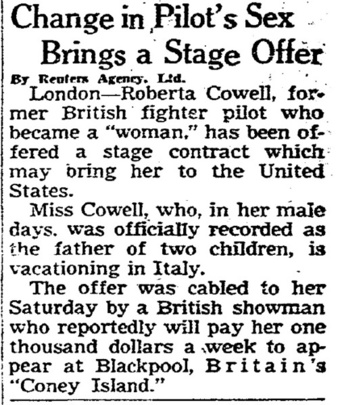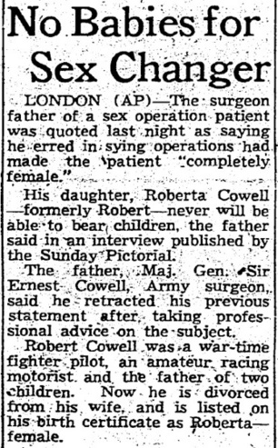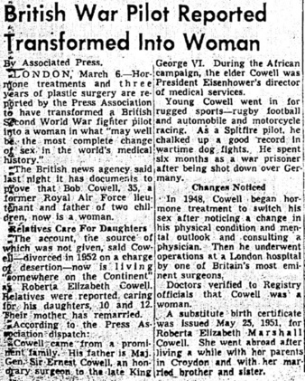 Collection: Newspaper and Periodical Clippings (1950-2000) Institution: Transas City Creator: The Associated Press Date: Mar. 6, 1954 Topics: Birth certificate amendments, Gender realignment surgery, Medicalisation, Military, MtFs, Physicians, Plastic surgery, Transgender parents, Transitioning (Gender) Subject: Roberta Cowell