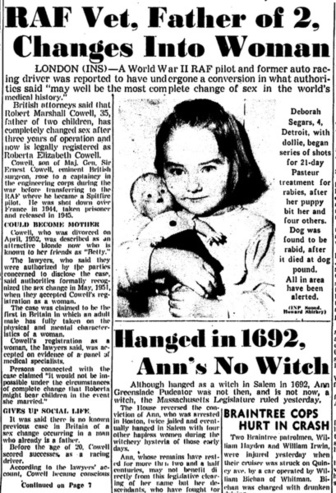 Collection: Newspaper and Periodical Clippings (1950-2000) Institution: Transas City Creator: The Associated Press Date: Mar. 6, 1954 Topics: Birth certificate amendments, Gender realignment surgery, Medicalisation, Military, MtFs, Physicians, Plastic surgery, Transitioning (Gender) Subject: Roberta Cowell -