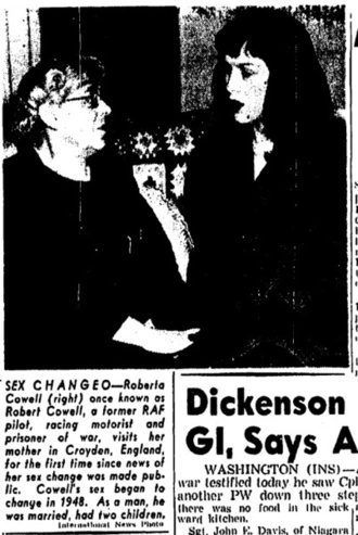 Collection: Newspaper and Periodical Clippings (1950-2000) Institution: Transas City Creator: International News Photos Date: Apr. 21, 1954 Topics: Air pilots, Military, Automobile racing drivers, Ex-prisoners of war, Gender affirming surgery, Motorsports, MtFs, Parents of transgender people, Transgender parents, Transgender people, Transsexual people Subject: Roberta Cowell -