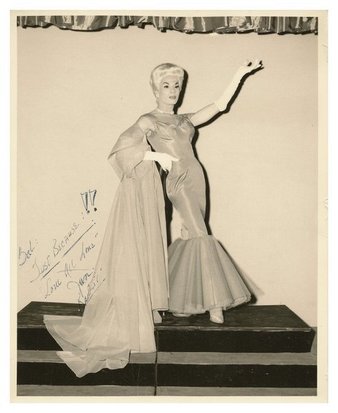 Collection: JD Doyle Photographs (1950-2000) Institution: JD Doyle Archives Creator: Date: circa 1960 Topics: Crossdressers, Female impersonators, Photography, Theatre shows Subject: Billy Daye, Bobby Lake, Clinton, Dale Roberts, Dodie Daniels, Dori D'Or, Jerry Stewart, Jewel Box Revue, Lynne Roberts, Mickey Marlowe, Tommy Harbin, Vicky Vogue Description: Bottow row, all sitting: unknown person, Gene Avery, unknown person, unknown female impersonator on ramp, Dale Roberts, unknown person Second row: Lynne Roberts, Dodie Daniels, Clinton (kneeling)... -