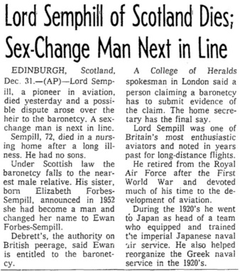 Lord Semphill of Scotland Dies; Sex-Change Man Next in Line
