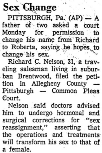 Collection: Newspaper and Periodical Clippings (1950-2000) Institution: Transas City Creator: Herndon, G. O. Date: Nov. 23, 1966 Topics: FtMs, Gender realignment surgery, Hormone therapy, Marriage, MtFs, Physicians, Transgender people Subject: John E. Hoopes, Johns Hopkins Gender Identity Clinic, Johns Hopkins Hospital, University of California Medical Center -