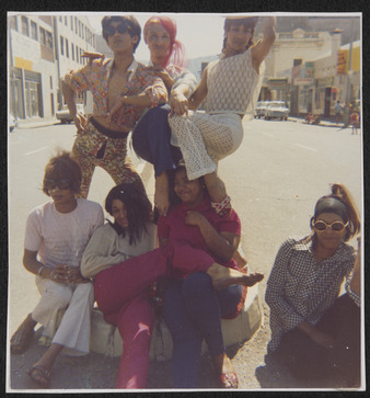 Collection: Kewpie Photographs Institution: Gay & Lesbian Memory in Action (GALA) Creator: Date: circa 1960 to circa 1980 Topics: Beauty operators, Gender minorities, Multiracial LGBTQ+ people Subject: Kewpie, Sue Thompson Description: This photo was captioned by Kewpie when the photos were transferred to GALA in 1999: Olivia, Kewpie, Patti (all at back, L-R), Sue Thompson, Brigitte, Gaya, Mitzy (all in front, L-R) in Sir Lowry ...