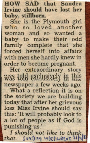 Collection: Newspaper and Periodical Clippings (1950-2000) Institution: Transgender Archives, University of Victoria Creator: Date: Apr. 21, 1982 Topics: Partners of transgender people, Pregnancy, Stillbirth Subject: Sandra Irvine Description: Clipping originally collected by Richard Ekins (from The University of Ulster Trans-Gender Archives/Richard Ekins collection at the Transgender Archives, University of Victoria) -