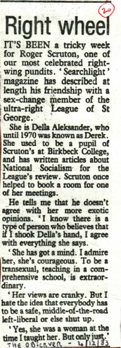 Collection: Newspaper and Periodical Clippings (1950-2000) Institution: Transgender Archives, University of Victoria Creator: Date: Apr. 12, 1983 Topics: Educators, MtFs, Politics, Transsexual people Subject: Della Aleksander, League of St. George, Roger Scruton Description: Clipping originally collected by Richard Ekins (from The University of Ulster Trans-Gender Archives/Richard Ekins collection at the Transgender Archives, University of Victoria) -