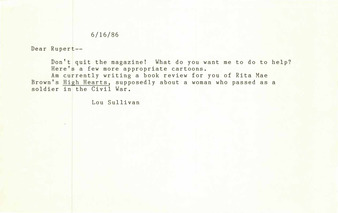Correspondence from Lou Sullivan to Rupert Raj (June 16, 1986)