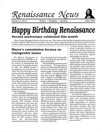 Collection: Renaissance News & Newsletters Institution: Transgender Archives, University of Victoria Creator: Renaissance Education Association Date: May 1989 Topics: Cosmetics, Crossdressing, Discrimination, Events, Money, Religions, Sexual minorities, Shopping, Transgender rights, Transphobia, Transsexual people Subject: Chicago Gender Society, International Foundation for Gender Education (IFGE), The Mayor's Commission on Sexual Minorities (MCSM), Transgender Issues Work Group (TIG)