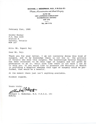 Collection: Rupert Raj Collection Institution: The ArQuives Creator: Berderman, Micheal J. Date: Feb. 21, 1989 Topics: Gender affirming surgery Subject: Michael J. Bederman, Rupert Raj Description: Michael J. Bederman responds to Rupert Raj regarding permission to perform a gender-affirming procedure in Ontario. -