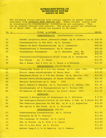 Collection: Outreach Publications Institution: Joseph A. Labadie Collection, University of Michigan Creator: The Human Outreach and Achievement Institute Date: Autumn 1989 Topics: Counseling, Femininities, LGBTQ+ relationships, Masculinities, Psychotherapy, Sexuality, Subcultures Subject: Ari Kane, Human Outreach and Achievement Institute, International Foundation for Gender Education (IFGE), Joseph Campbell, Louis G. Sullivan, Nancy S. Ledins, Naomi Owen, The Truth About Changing Sex, Transvestites and Transsexuals: Toward of a Theory of Cross-Gender Behavior, William R. Stayton -