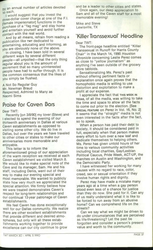 Collection: Newspaper and Periodical Clippings (1950-2000) Institution: JD Doyle Archives Creator: Date: Mar. 30, 1990 to Apr. 5, 1990 Topics: Elections, LGBTQ+ activism, LGBTQ+ phobia, Transgender political activists Subject: Houston Chronicle, Leslie Perez, This Week in Texas (TWT) Description: A letter to the editor printed in the March 30-April 5 issue of "The Week in Texas" (TWT). The text discusses Leslie Perez's activism and role in the Harris County Chair Runoff election.