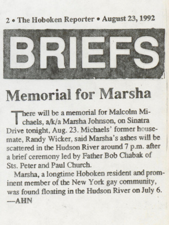 Collection: Marsha P. Johnson & Sylvia Rivera Institution: The Lesbian, Gay, Bisexual & Transgender Community Center Creator: Date: Aug. 23, 1992 Topics: Black transgender people, Drag queens, Memorials, QTPOC, Transfeminine people Subject: Marsha P. Johnson, Randy Wicker Description: A newspaper clipping announcing a memorial for Marsha P. Johnson. -