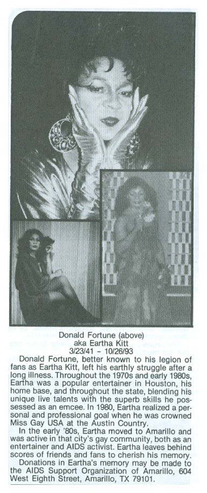 Collection: Newspaper and Periodical Clippings (1950-2000) Institution: JD Doyle Archives Creator: Date: Nov. 26, 1993 Topics: AIDS activists, Drag community, HIV/AIDS Subject: Donald Fortune, Eartha Kitt, Miss Gay USA Description: This is an obituary for Donald Fortune aka Eartha Kitt, who was known for his participation in pageants and AIDS activism. -