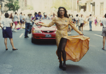 Collection: Marsha P. Johnson & Sylvia Rivera Institution: The Lesbian, Gay, Bisexual & Transgender Community Center Creator: Date: Jun. 26, 1994 Topics: AIDS activists, Latino/a/x transgender people, LGBTQ+ demonstrations, Trans women, Transfeminine people, Transgender political activists Subject: ACT UP, Sylvia Rivera Description: A photograph of Sylvia Rivera in a yellow dress at an ACT-UP march in Union Square Park in 1994. -