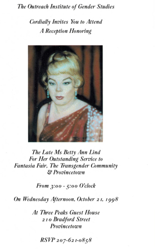 Collection: Fantasia Fair: Miscellaneous Documents Institution: Joseph A. Labadie Collection, University of Michigan Creator: The Outreach Institute of Gender Studies (OIGS) Date: 1998 Topics: LGBTQ+ events, Transgender community, Transgender people Subject: Betty Ann Lind, Fantasia Fair, Outreach Institute of Gender Studies (OIGS) Description: Invitation to attend a reception honoring Betty Ann Lind for outstanding service to Fantasia Fair, the Transgender community, and Provincetown. This invitation came from Alison Laing's personal col...