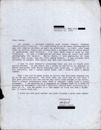 Collection: Marsha P. Johnson & Sylvia Rivera Institution: The Lesbian, Gay, Bisexual & Transgender Community Center Creator: Giard, Robert Date: Jan. 18, 1999 Topics: Gay men, Latino/a/x transgender people, Puerto Rican women, QTPOC, Stonewall riots, Trans women, Venezuelan Americans Subject: Don Lucas, Hal Call, Harry Hay, Jack Nichols, José Sarria, Martin Duberman, Robert Giard, Stonewall, Sylvia Rivera, Uplift Lighting Description: A letter to Randy Wicker from a photographer asking to be connected to Sylvia Rivera to take her portrait. -