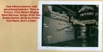 Collection: JD Doyle Photographs (1950-2000) Institution: JD Doyle Archives Creator: Date: circa 1968 Topics: Discos, Drag, Female impersonators Subject: Bobby Barton, Club Inferno, Criss Moore, Ethel Merman, Kurt Mann Description: Advertising banners read: "Here in person, Criss Moore singing Ethel Merman, Songs of the 30s"; "Bobby Barton, Body by Fisher"; "Kurt Mann, She's a Diller" -