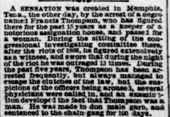 Collection: Newspaper and Periodical Clippings (Pre 1900) Institution: Digital Transgender Archive Creator: Date: Jul. 19, 1876 Topics: Arrests of LGBTQ+ people, BIPOC, Black transgender people, Memphis Race Riot, Memphis, Tenn., 1866, Outing (LGBTQ+ culture), Passing (Gender), Trans women, Transgender survivors of rape Subject: Frances Thompson Description: Content Warning: This item contains potentially sensitive content related to sexual assault. -