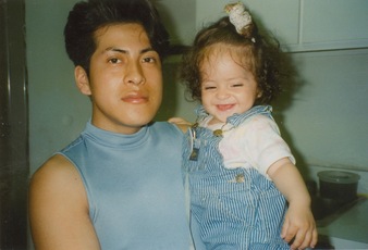 Collection: Miscellaneous Photographs Institution: The Lesbian, Gay, Bisexual & Transgender Community Center Creator: Date: Unknown Topics: Latino/a/x transgender people, Mexicans, QTPOC, Trans women Subject: Melissa Description: A photograph of Melissa wearing a blue sleeveless shirt holding a smiling baby wearing blue striped overalls. -