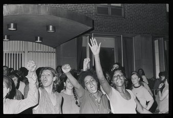 A Photograph of Sylvia Rivera and Other Protesters with Fists Raised at Weinstein Hall...