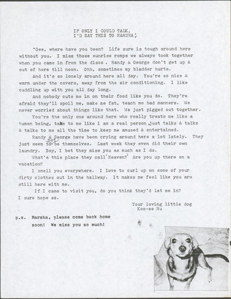 Collection: Marsha P. Johnson & Sylvia Rivera Institution: The Lesbian, Gay, Bisexual & Transgender Community Center Creator: Date: Unknown Topics: Black transgender people, Drag queens, Gay men, QTPOC, Transfeminine people Subject: George Flimlin, Koo-ee Nu, Marsha P. Johnson, Randy Wicker Description: A letter to Marsha P. Johnson written from the perspective of Koo-ee Nu, a dog belonging to her roommate Randy Wicker and his partner, David. -