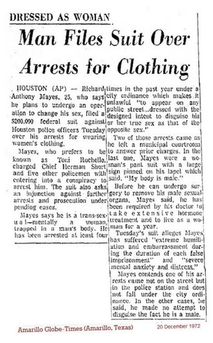 Collection: Newspaper and Periodical Clippings (1950-2000) Institution: JD Doyle Archives Creator: Houston Post Date: Sep. 22, 1972 Topics: Arrests, Crossdressing, Employment discrimination, Harassment, Legal process, MtFs, Police, Transsexual people Subject: Larry Sauer, Richard Anthony Mayes, Toni Rachelle Mayes -