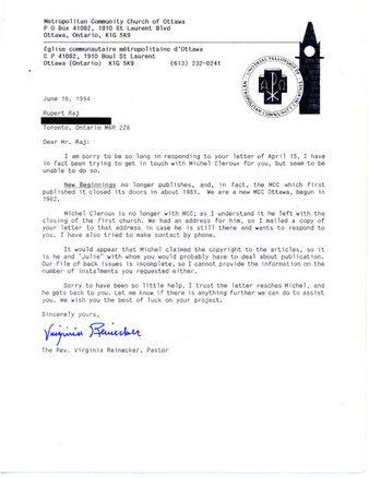 Letter from Rev. Virginia Reinecker to Rupert Raj