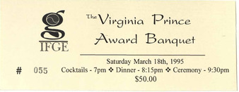 Collection: International Foundation for Gender Education Publications and Documents Institution: Schlesinger Library, Radcliffe Institute for Advanced Study, Harvard University Creator: International Foundation for Gender Education (IFGE) Date: 1995 Topics: Events, Tickets, Transgender community Subject: Virginia Prince Award -
