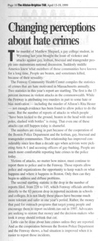 Collection: Newspaper and Periodical Clippings (1950-2000) Institution: Digital Transgender Archive Creator: Date: Apr. 13, 1999 Topics: Anti-transgender violence, Black transgender people, Hate crimes, Murders of LGBTQ+ people, Trans women Subject: Fenway Community Health Center, Matthew Shepard, Rita Hester Description: Content Warning: This item contains potentially sensitive material related to transphobic violence. -