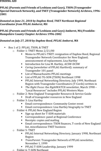 PFLAG (Parents and Friends of Lesbians and Gays), TSON (Transgender Special Outreach Network), and TNET (Transgender Network) Archives, 1996- 2001