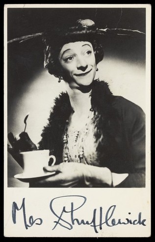 Mrs. Shufflewick (Rex Jameson), in drag character, holding a cup of tea. Photograph, ca. 1955.