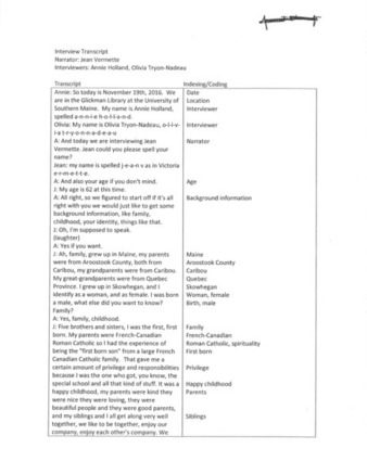 Collection: Audio and Video Clips and Transcripts Institution: LGBTQ+ Collection, University of Southern Maine Libraries Creator: Vermette, Jean, Holland, Annie, Tryon-Nadeau, Olivia Date: Nov. 19, 2016 Topics: Catholic schools, College theater, Crossdressing, Gender affirming surgery, LGBTQ+ divorce, LGBTQ+ spiritual people, MtFs, Sexual revolution, Transgender relationships, Transsexual people, Vietnam War, 1961-1975 Subject: EqualityMaine, Jean Vermette, Maharishi Maharesh Yogi, Maine Gender Resource and Support Service (Megress), Maine Lesbian Gay Political Alliance (MLPGA), Outright, Tiffany Club, Transsupport Maine Description: Jean Vermette, born in 1954, is a transgender woman from Skowhegan, Maine. At the age of three, Jean knew that her biological sex did not match her gender identity. When Jean came out as transgende... -
