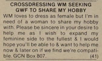 Collection: Newspaper and Periodical Clippings (1950-2000) Institution: Northeastern University Archives and Special Collections Creator: Date: Apr. 28, 1984 Topics: Advertising, Classified, Crossdressing, Lesbians, Personals Subject: Gay Community News Description: A classified ad by a crossdressing white male (WM) looking for a gay white female (GWF). Originally published on page 15 of volume 11, number 40 of Gay Community News. -