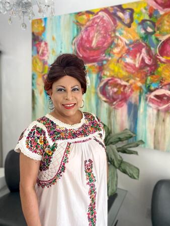 Collection: Miscellaneous Photographs Institution: OUTWORDS Creator: Date: Unknown Topics: AIDS activists, Latino/a/x transgender people, QTPOC, Trans women Subject: Elia Chinó Description: Two photographs of Elia Chinò wearing a white dress with colorful floral details with a white flower behind her ear. She is smiling in both photographs. -