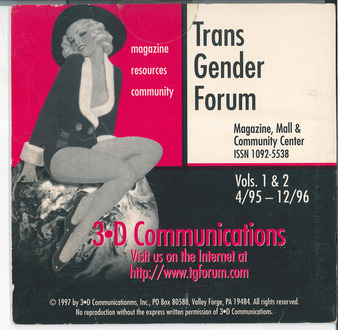 Collection: Discovery Resources Institution: Queer Digital History Project Creator: 3-D Communications, Inc. Date: 1997 Topics: Internet forums, Transgender community, Transgender people Subject: Cindy Martin, Jamie Faye Fenton, JoAnn Roberts, TGForum Description: This disc contains content orginally published on TGForum.com from April 1995 to December 1996. This disc was produced by 3-D Communications, Inc. in 1997. TGForum was founded in 1995 by Cindy ... -