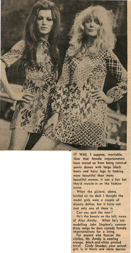 Collection: Newspaper and Periodical Clippings (1950-2000) Institution: Transgender Archives, University of Victoria Creator: Date: Unknown Topics: Appearance, Clothing, Crossdressers, Photographic models Subject: Alan Amsby, Cindy Steeden Description: Clipping originally collected by Richard Ekins (from The University of Ulster Trans-Gender Archives/Richard Ekins collection at the Transgender Archives, University of Victoria) -