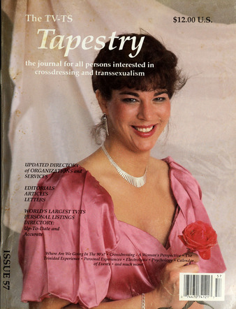 Collection: Transgender Tapestry Institution: Transgender Oral History Project Creator: Lynn, Merissa Sherrill Date: 1991 Topics: Crossdressers, Crossdressing, Fairs, Photography, Social activities clubs, Transgender movement, Transsexual people, Transsexualism Description: Also known as: "The TV Tapestry", "The Tapestry", "Tapestry" and "TV/TS Tapestry Journal." ; Magazine name changes to "Transgender Tapestry" starting with issue 74, winter 1995. ; On item: the jour...