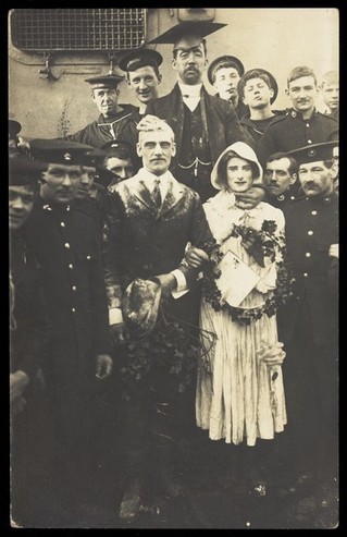 Sailors on H.M.S Dominion, one in bridal drag, conduct a mock wedding on Christmas Day. Photographic postcard, 1915.