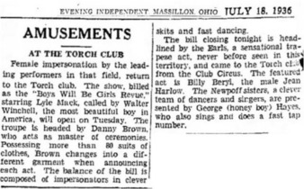 Collection: Newspaper and Periodical Clippings (1900-1949) Institution: JD Doyle Archives Creator: Date: Nov. 14, 1937 Topics: Drag, Drag queens, Female impersonators, Musical theatre, Night life Subject: Flo Arden, George Hayes, Gypsy Rose Lee, Jackie Starr, Kate Smith, Marjorie Jayne, Paul Russell -