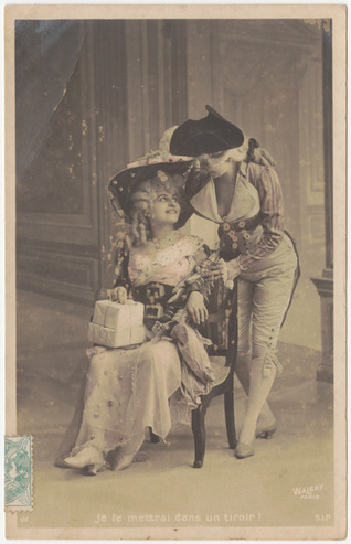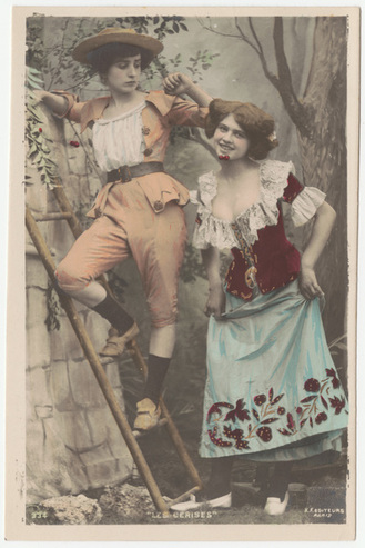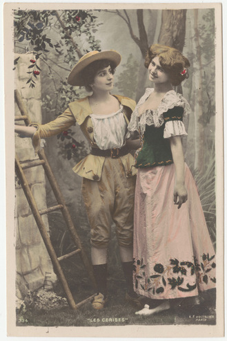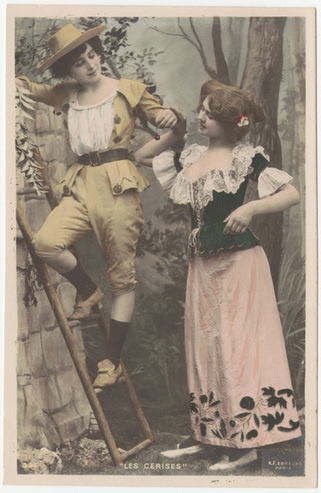 Collection: Postcards of Female and Male Impersonators and Cross-dressing Institution: Human Sexuality Collection, Cornell University Creator: Kunzli Freres Editeurs Date: circa 1900 Topics: Male impersonators Description: Set of 10 cards with photo narrative of an 18th-century seduction scene. "Male"climbs ladder to pick cherries, offers to female, tries to kiss her. Undivided verso. -