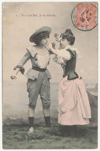 Collection: Postcards of Female and Male Impersonators and Cross-dressing Institution: Human Sexuality Collection, Cornell University Creator: Date: circa 1905 Topics: Male impersonators Description: Postcard of four women: three dressed as 17th-century musketeers and one dressed as a male gardener wearing a work apron and heavy clogs and holding a rake. The two women at the center are the same...