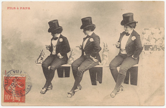 Collection: Postcards of Female and Male Impersonators and Cross-dressing Institution: Human Sexuality Collection, Cornell University Creator: Date: 1907 Topics: Male impersonators Description: Inscription: Message on verso addressed to "Mon cher Pierre" and signed "Jeanne." Novelty card montage of three photos of the same woman dressed in top hat, tails and knee britches gesturing to a r... -