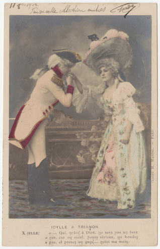 Collection: Postcards of Female and Male Impersonators and Cross-dressing Institution: Human Sexuality Collection, Cornell University Creator: H. Manuel Date: 1902 Topics: Male impersonators Description: Set of 3 cards with photo narrative of an 18th-century seduction scene. “Male” officer invites a female aristocrat to dance in a studio-set salon. Numbered I, II and X (missing from the postcards i... -